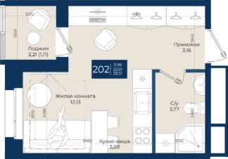 Жилой комплекс "Новатория", 1 очередь строительства, Корпус А, Квартира 202 общей площадью 23,12 м2 на 6 этаже.ЖК "Новатория" —жилой комплекс комфорт-класса расположен в поселке Новоселье, в окружении леса и Шунгеровского заказника.