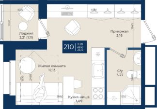 Жилой комплекс "Новатория", 1 очередь строительства, Корпус А, Квартира 210 общей площадью 23,12 м2 на 7 этаже.ЖК "Новатория" —жилой комплекс комфорт-класса расположен в поселке Новоселье, в окружении леса и Шунгеровского заказника.