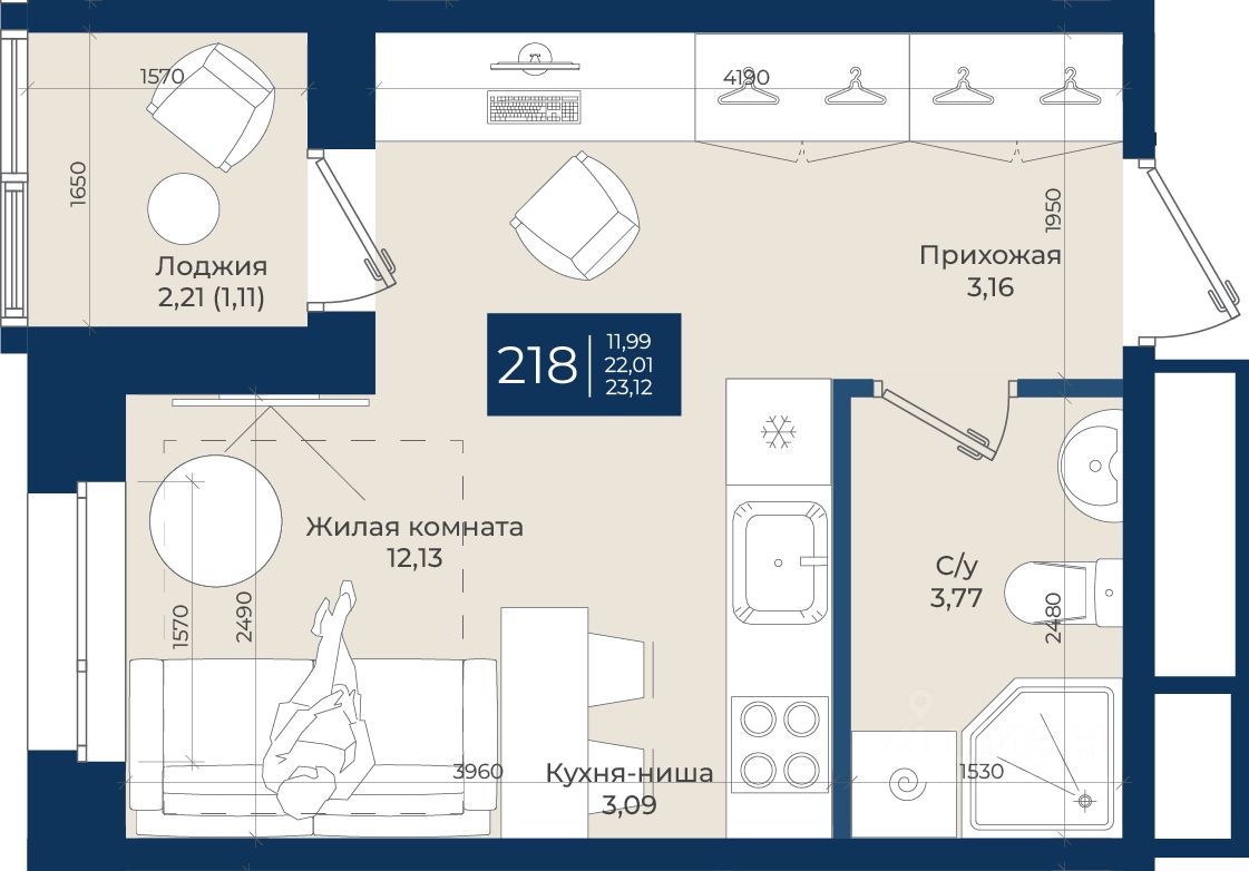 Жилой комплекс "Новатория", 1 очередь строительства, Корпус А, Квартира 218 общей площадью 23,12 м2 на 8 этаже.ЖК "Новатория" —жилой комплекс комфорт-класса расположен в поселке Новоселье, в окружении леса и Шунгеровского заказника.