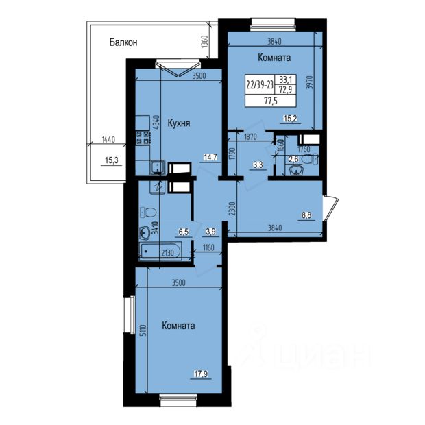 родается большая двухкомнатная квартира. Это жилье, общая площадь которого составляет 77.5 м2, а жилая - 33.1 м2, прекрасно подойдет семейным покупателям. Очень просторная кухня (14.7 м2) порадует и кулинаров, и любителей семейных чаепитий. К кухонному помещению примыкает панорамная лоджия, откуда открывается прекрасный вид. Комнаты изолированы, в обеих - большие окна с двухкамерными стеклопакетами. В большой прихожей хватит места не только для входной зоны, но и для платяных шкафов. Раздельный санузел расположен в центре квартиры, что удобно для всех жильцов.
