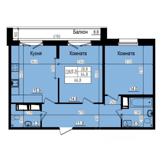 Продается двухкомнатная квартира (возможен заказ предчистовой отделки, подробности - в отделе продаж). Общая площадь составляет 66.8 м2, жилая - 28.8 м2, потолки - 2.73 м. Между кухней (15.9 м2) и соседней комнатой отсутствует перегородка, что позволяет будущим жильцам самим решить хотят они большую кухню-гостиную или же две отдельные комнаты и стандартную кухню. Выйти на длинный (почти 7 м2) панорамный балкон можно как из кухни, так и из примыкающей комнаты. Отсюда открывается прекрасный вид на знаменитый Шуваловский парк. Жилые комнаты изолированы. По разным сторонам просторной прихожей расположились два санузла.