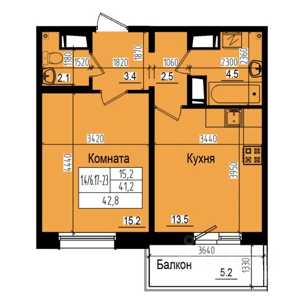 Продается однокомнатная квартира общей площадью 42.8 м2 с высокими потолками - 2.73 м. Жилая комната среднего размера (15.2 м2) позволяет расставить необходимую мебель, не переплачивая за лишние метры. Большое окно с двойными стеклопакетами дает достаточно света, сохраняя при этом тепло. Просторная (13.5 м2), почти квадратная кухня имеет выход на балкон. Прихожая разделена на две зоны, что делает более удобным устройство шкафа или ниши. Санузел раздельный, ванная и туалет разведены по разным сторонам прихожей.