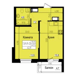 Продается однокомнатная квартира (чистовую отделку можно заказать у застройщика). Общая площадь 42.9 м2, жилая - 13.9 м2, потолки - 2.73 м. Это современное и эргономичное жилье для одного человека или семейной пары без детей. Комната имеет комфортную, почти квадратную форму, большое окно оснащено двухкамерными стеклопакетами. Просторная кухня (15.8м2) имеет выход на застекленную лоджию (3.7 м2), окна которой выходят во двор. В совмещенном санузле площадью хватит места для сантехники и стиральной машины. Из прихожей можно попасть в 3-х метровую гардеробную.