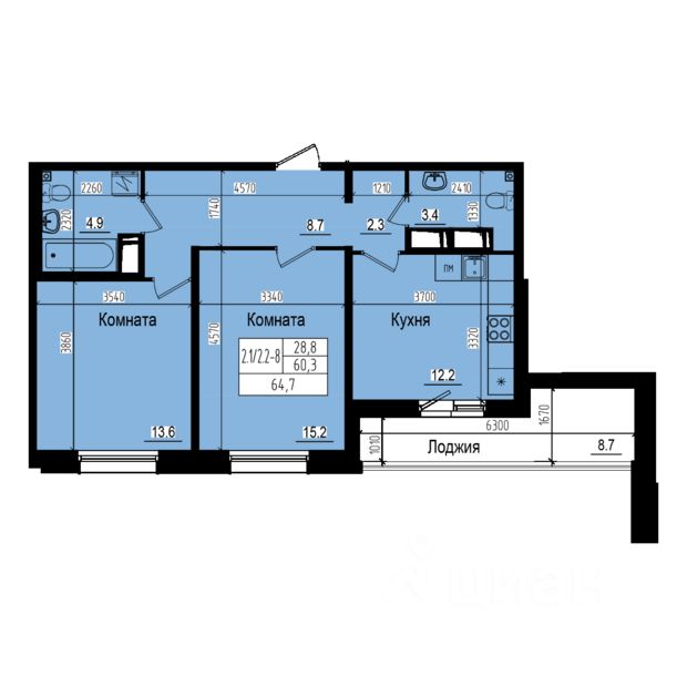 Продается двухкомнатная квартира (возможен заказ отделки white box и чистовой отделки, подробности узнавайте в отделе продаж), которая подойдет для небольшой семьи. Общая площадь составляет 64.7 м2, жилая  28.8 м2, потолки  2.73 м. Две прямоугольные комнаты сопоставимы по размеру и изолированы друг от друга, окна  с двухкамерными стеклопакетами. Большая кухня (12.2 м2) имеет выход на лоджию с панорамным остеклением, пространство которой позволяет организовать там зону отдыха или небольшой кабинет. По разным сторонам просторной прихожей расположились два санузла.