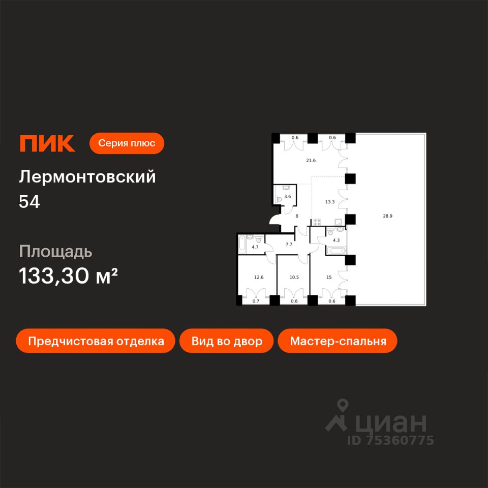 Продаётся 3-комн. квартира площадью 133,3 кв.м на 8 этаже 9 этажного дома (Корпус 1, Секция 2) проекта ПИК Лермонтовский 54. Светлый просторный подъезд на уровне земли, функциональная планировка, большие окна, предчистовая отделка.