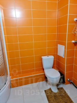 - Санузел с плиткой из керамогранита, душевой кабиной, зеркалом и стиральной машиной "Электролюкс".