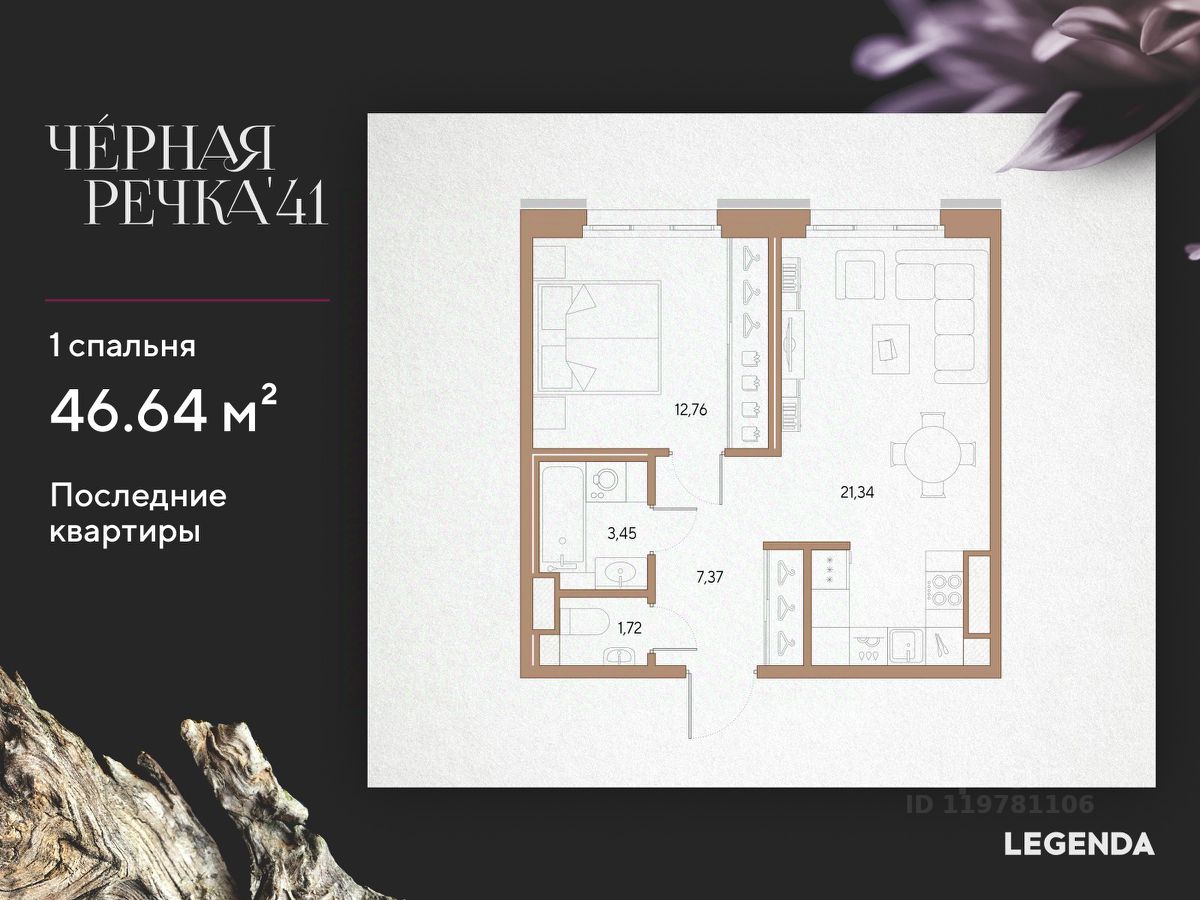 Продается однокомнатная квартира с предчистовой отделкой в ЖК "Черная Речка, 41" на 9 этаже. Общая площадь: 46.64 кв.м., жилая: 12.76 кв.м., площадь просторной кухни-столовой: 21.34 кв.м. Все окна выходят на одну сторону. В квартире один раздельный санузел. Высота потолков 3.0 м.