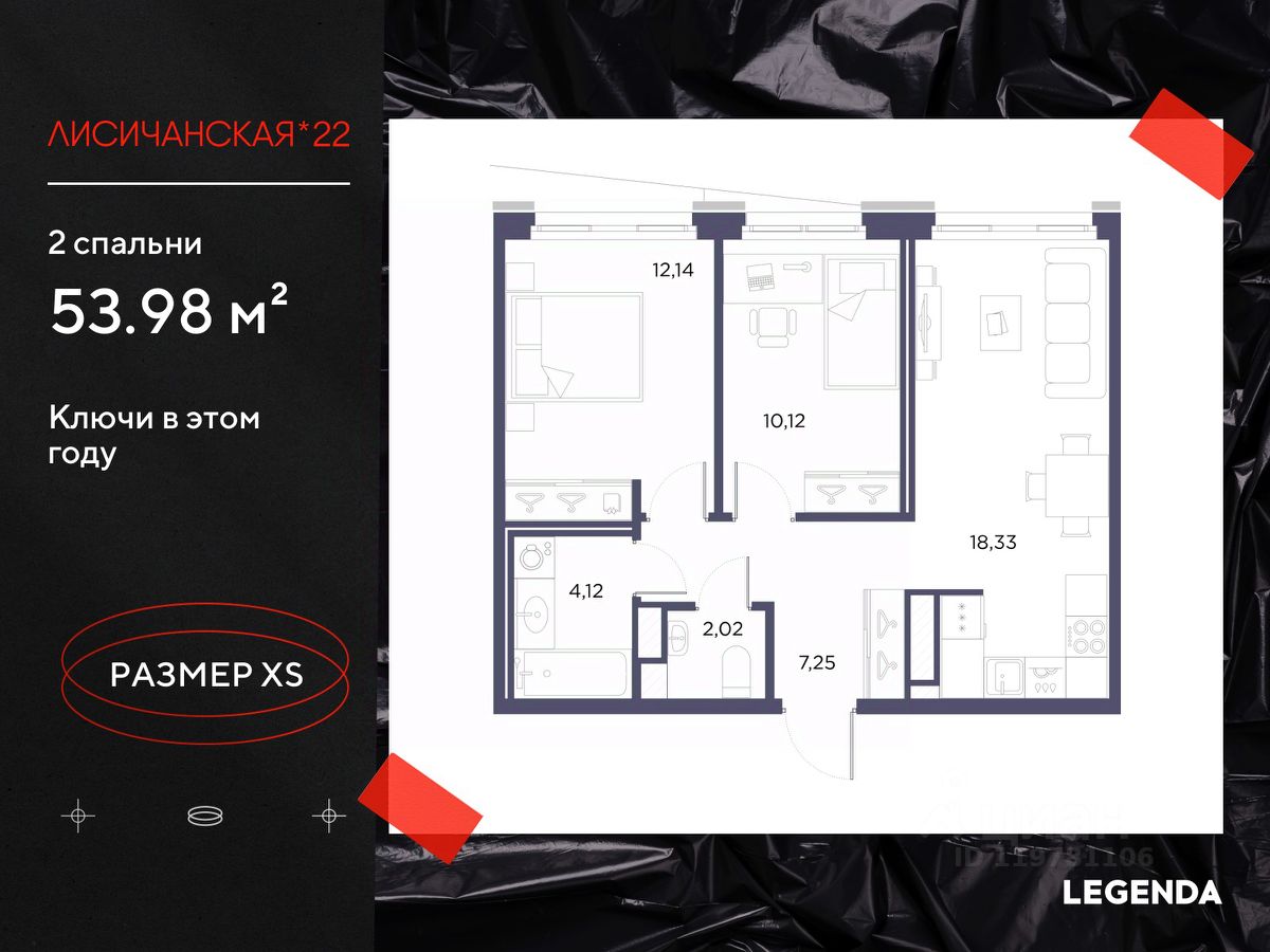 Двухкомнатная квартира с предчистовой отделкой в ЖК "Лисичанская, 22" на 9 этаже. Общая площадь: 53.98 кв.м., жилая: 22.26 кв.м., площадь просторной кухни-столовой: 18.33 кв.м. Комнаты изолированные, все окна выходят на одну сторону. В квартире один раздельный санузел. Высота потолков 2.7 м.