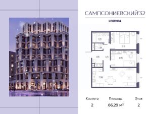 Квартира с двумя спальнями в комплексе "Сампсониевский 32" от LEGENDA на 2 этаже.