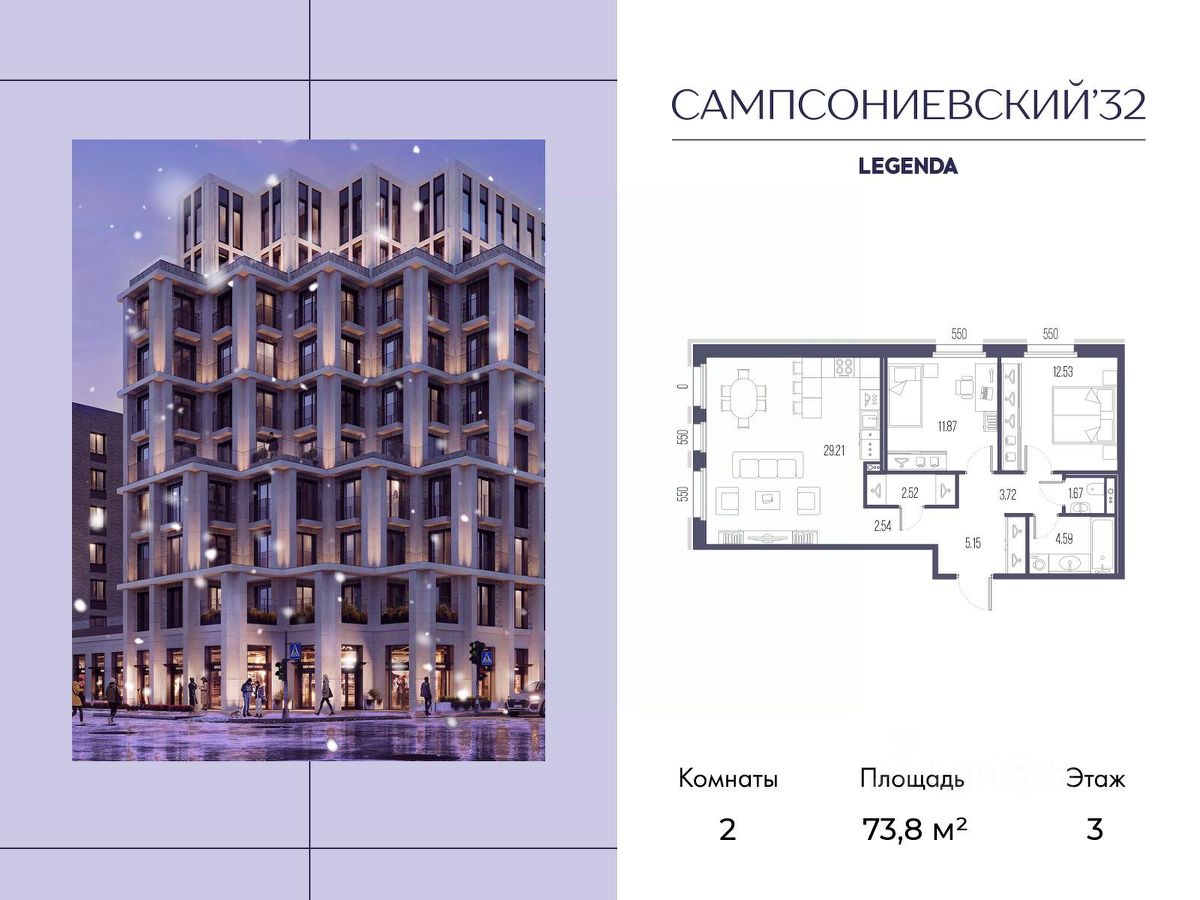 Квартира с двумя спальнями в комплексе "Сампсониевский 32" от LEGENDA на 3 этаже.