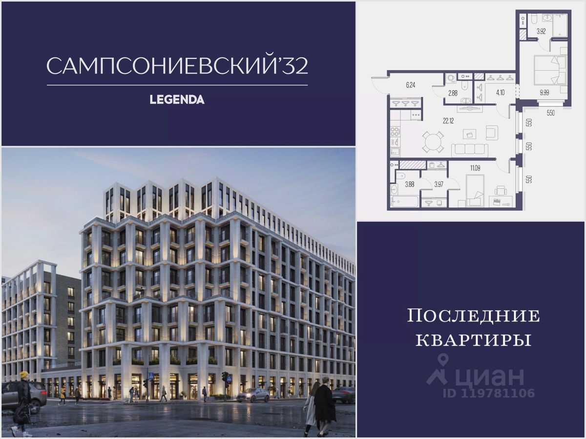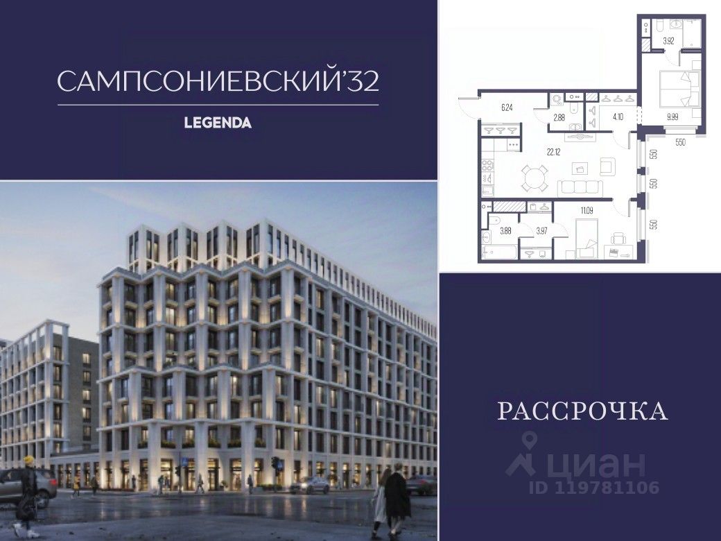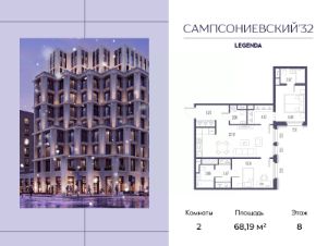 Квартира с двумя спальнями в комплексе "Сампсониевский 32" от LEGENDA на 8 этаже.