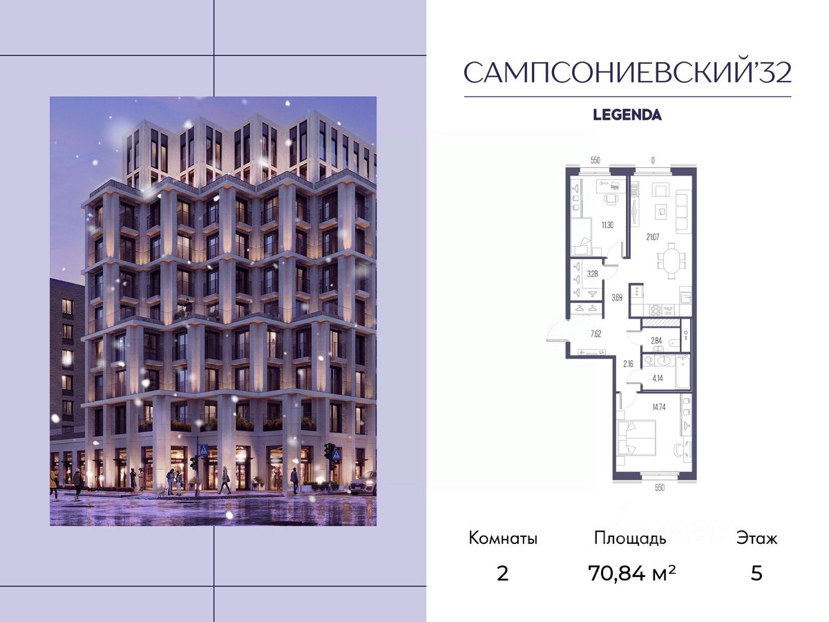 Квартира с двумя спальнями в комплексе "Сампсониевский 32" от LEGENDA на 5 этаже.