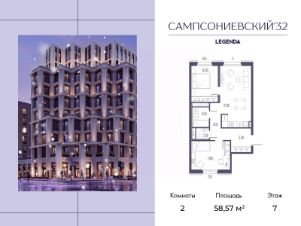 Квартира с двумя спальнями в комплексе "Сампсониевский 32" от LEGENDA на 7 этаже.