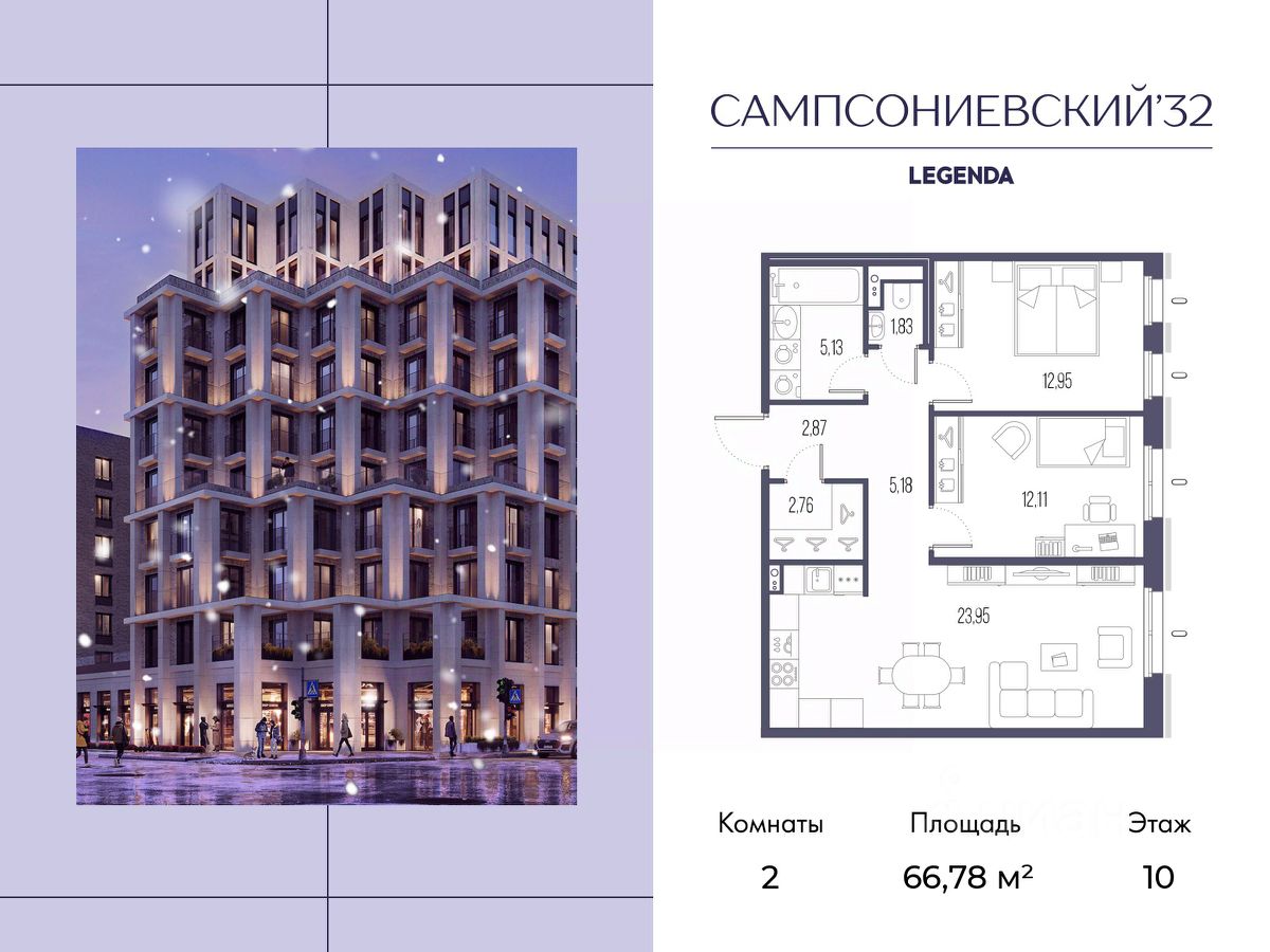 Квартира с двумя спальнями в комплексе "Сампсониевский 32" от LEGENDA на 10 этаже.