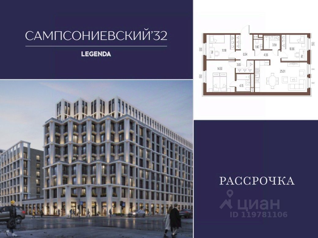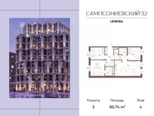 Квартира с тремя спальнями в комплексе "Сампсониевский 32" от LEGENDA на 4 этаже.