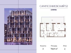 Квартира с тремя спальнями в комплексе "Сампсониевский 32" от LEGENDA на 2 этаже.