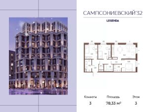 Квартира с тремя спальнями в комплексе "Сампсониевский 32" от LEGENDA на 3 этаже.