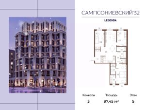 Квартира с тремя спальнями в комплексе "Сампсониевский 32" от LEGENDA на 5 этаже.