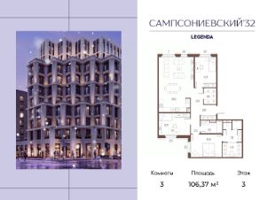 Квартира с тремя спальнями в комплексе "Сампсониевский 32" от LEGENDA на 3 этаже.