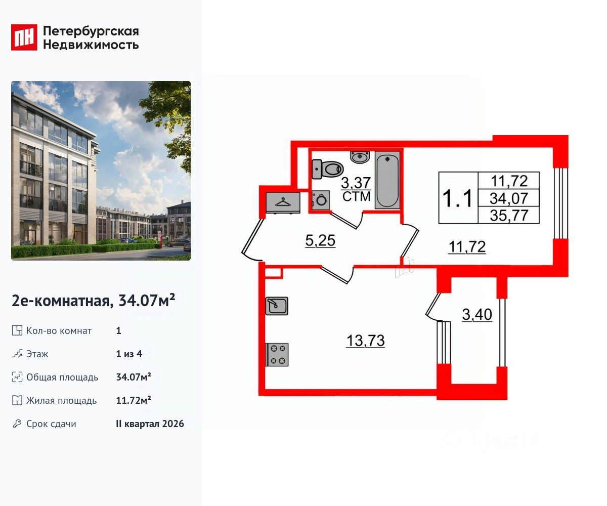 Удобная, классическая, функциональная европланировка, большая кухня-гостиная 13.73 м², просторная прихожая 5.25 м². Общая площадь квартиры - 34.07 м², жилая 11.72 м², высота потолка 2.75 м.