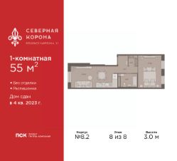 Однокомнатная квартира от застройщика в ЖК "Северная корона" на 8 этаже. Квартира без отделки, после получения ключей можно делать ремонт. Общая площадь: 55 кв.м., жилая: 17.86 кв.м., площадь просторной кухни-столовой: 23.05 кв.м. Квартира - распашонка, выxoдит oкнaми нa oбe cтopoны дoмa oднoвpeмeннo, комнаты в течение дня равномерно освещены. В квартире один совмещенный санузел. Высота потолков 3.0 м.