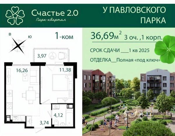 Квартира 19 в малоэтажном районе Счастье 2.0 - это особое, продуманное до мелочей, пространство для жизни в одном из самых живописных районов Санкт-Петербурга, в непосредственной близости от дворцово-паркового ансамбля Павловска. Все составляющие квартала направлены на максимальный комфорт его жителей: оригинальная архитектура, закрытые и безопасные дворы, современные планировки квартир, великолепная природа южного пригорода в сочетании с развитием собственной коммерческой и социальной инфраструктуры. Срок сдачи - 1 кв. 2025 года