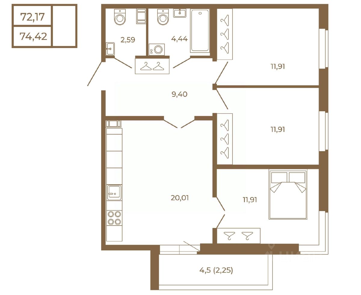 Продаётся 3-комнатная квартира в строящемся доме (Корпус 8.2), срок сдачи: IV-кв. 2025, общей площадью 74.42 кв.м., на 2 этаже. ЖК расположен в Сертолово, мкр.Черная речка. 25 минут на машине до метро Парнас, либо 30 минут до метро Пр.Просвещения.