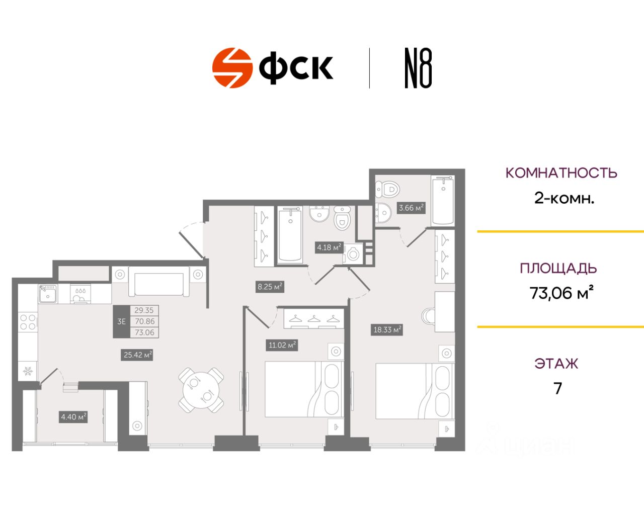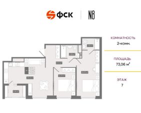 Прямая продажа от застройщика — только в этом месяце. 2-к квартира в клубном доме N8 на 7-м этаже. Общая площадь 73,06. Без отделки.