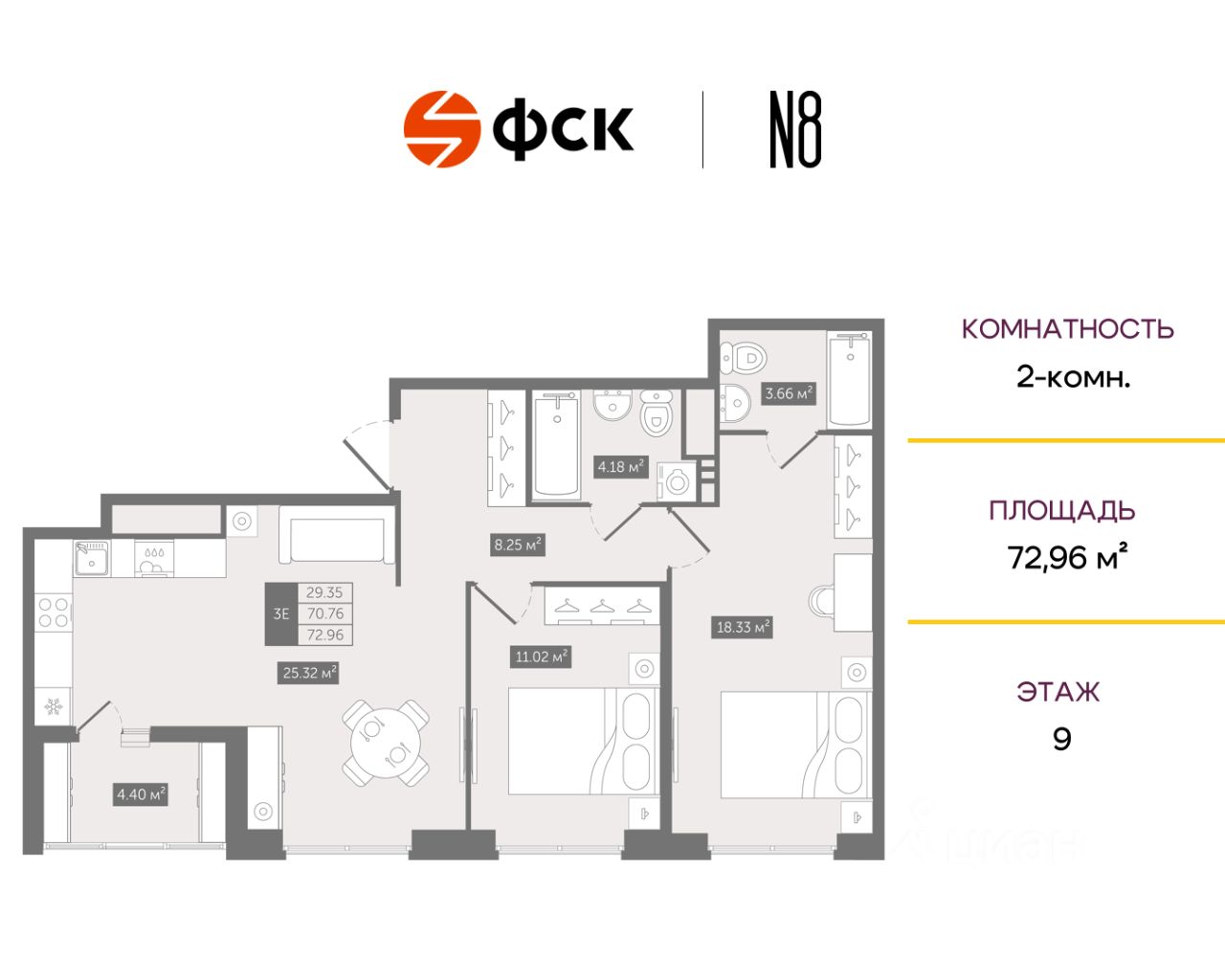 Прямая продажа от застройщика — только в этом месяце. 2-к квартира в клубном доме N8 на 9-м этаже. Общая площадь 72,96. Без отделки.