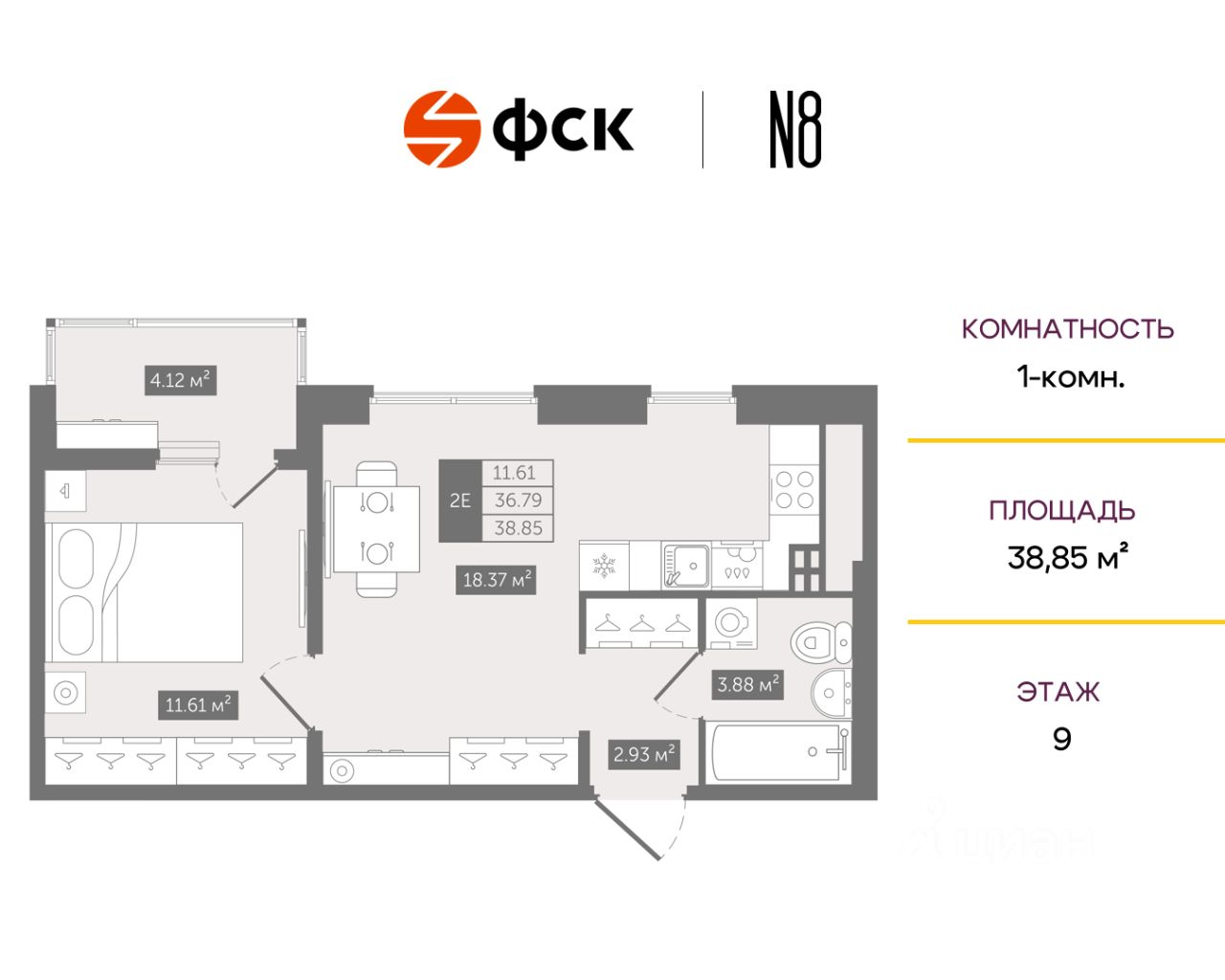 Прямая продажа от застройщика — только в этом месяце. 1-к квартира в клубном доме N8 на 9-м этаже. Общая площадь 38,85. Без отделки.