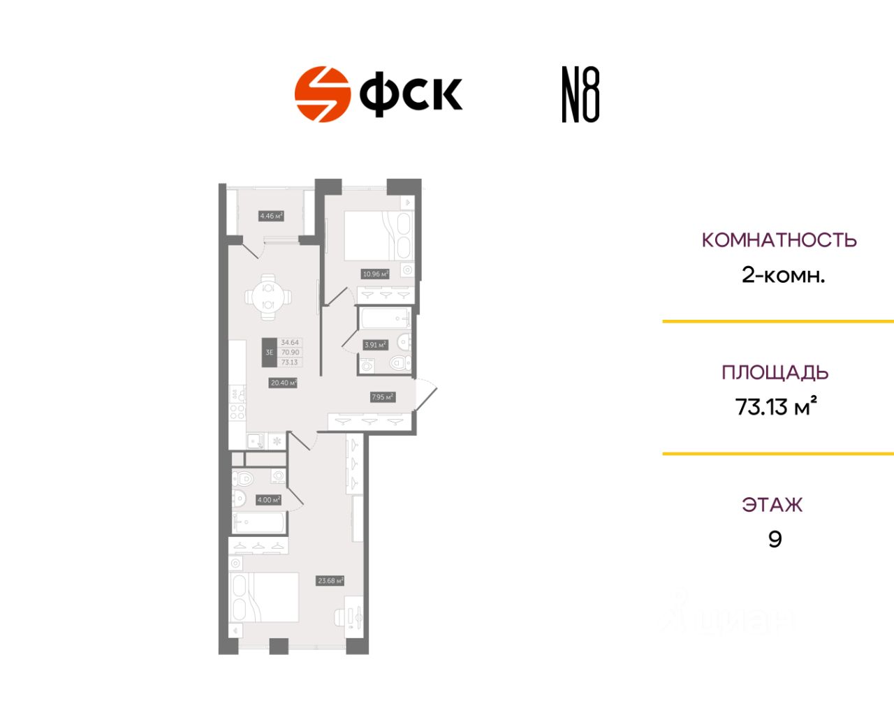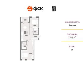 Прямая продажа от застройщика — только в этом месяце. 2-к квартира в клубном доме N8 на 9-м этаже. Общая площадь 73,13. Без отделки.