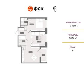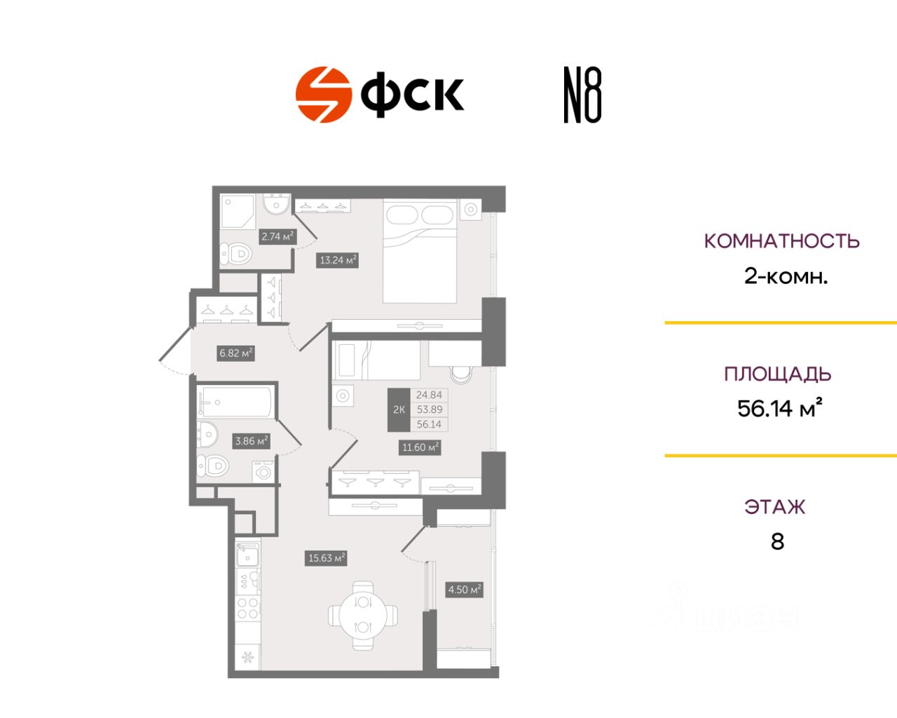Прямая продажа от застройщика — только в этом месяце. 2-к квартира в клубном доме N8 на 8-м этаже. Общая площадь 56,14. Без отделки.