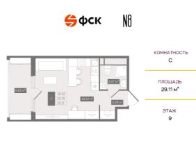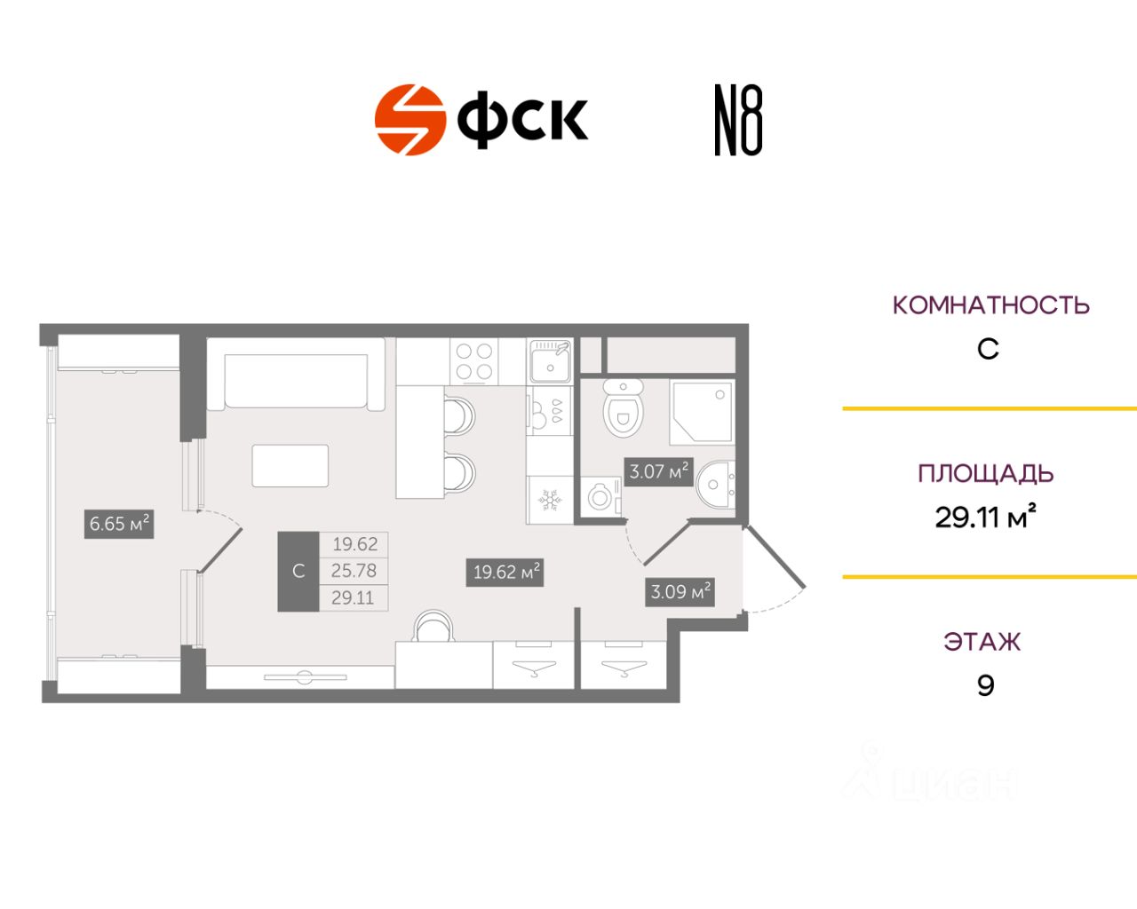 Прямая продажа от застройщика — только в этом месяце. Студия в клубном доме N8 на 9-м этаже. Общая площадь 29,11. Без отделки.