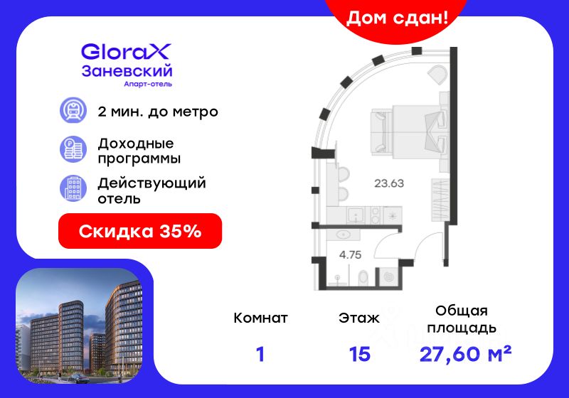 Продается апартамент-студия на 15-м этаже в сданном Апарт-комплексе бизнес-класса "GloraX Заневский". Ключи сразу! Общая площадь лота составляет 28,38 кв. м, из которых 23,63 кв. м отведено под жилую. Номер апартамента - 1 502.