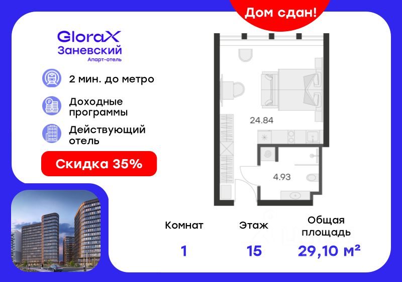 Продается апартамент-студия на 15-м этаже в сданном Апарт-комплексе бизнес-класса "GloraX Заневский". Ключи сразу! Общая площадь лота составляет 29,77 кв. м, из которых 24,84 кв. м отведено под жилую. Номер апартамента - 1 506.