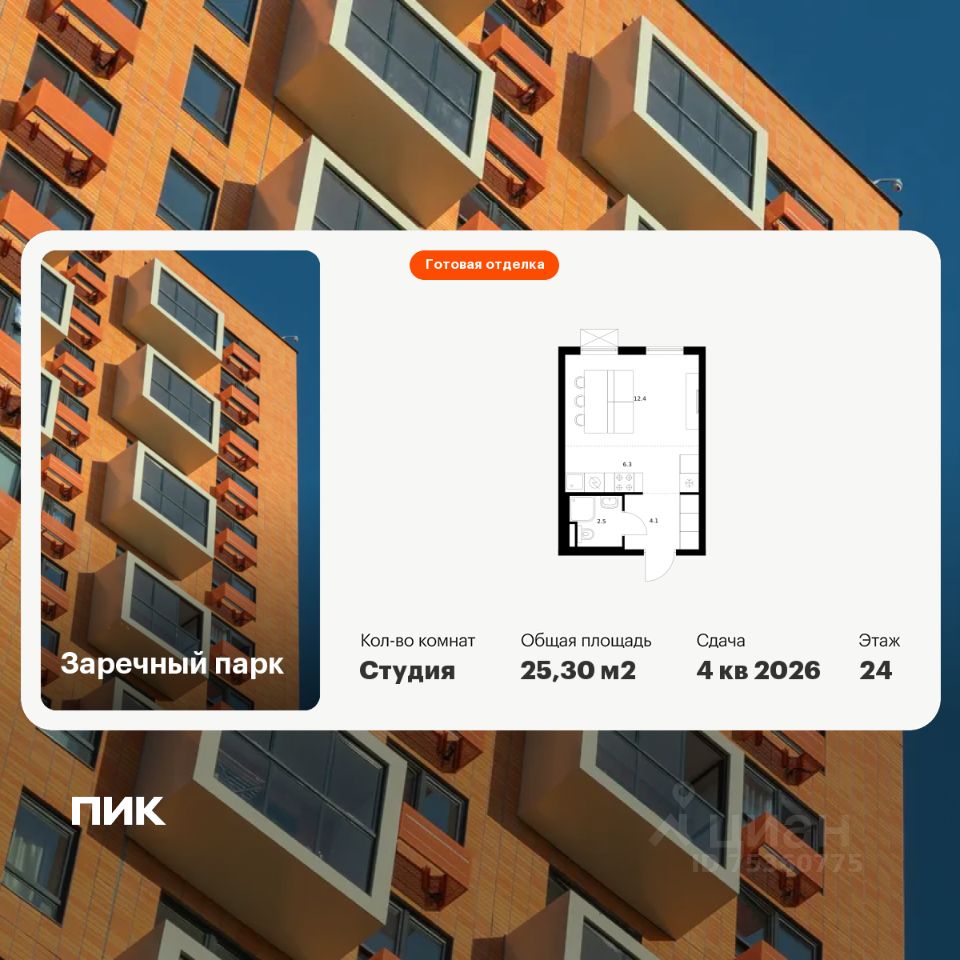 Продаётся квартира-студия площадью 25,3 кв.м на 24 этаже 24 этажного дома (Корпус 6, Секция 2) проекта ПИК Заречный парк. Светлый просторный подъезд на уровне земли, функциональная планировка, большие окна, c отделкой.