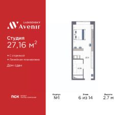 Просторные 1-комн. апартаменты-студия с отделкой в ЖК "Ladozhsky AVENIR" на 6 этаже. Общая площадь: 27.16 кв.м., площадь гостиной 23.11 кв.м., из которых 5 кв.м. выделено под кухонную зону. Все окна выходят на одну сторону. В апартаментах один совмещенный санузел. Высота потолков 2.7 м.