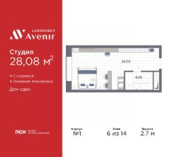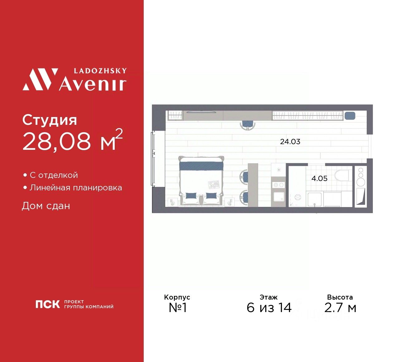 Продаются 1-комн. апартаменты-студия от застройщика с отделкой в ЖК "Ladozhsky AVENIR" на 6 этаже. Общая площадь: 28.08 кв.м., площадь гостиной 24.03 кв.м., из которых 5 кв.м. выделено под кухонную зону. Все окна выходят на одну сторону. В апартаментах один совмещенный санузел. Высота потолков 2.7 м.