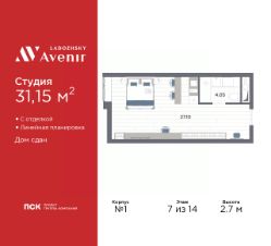 Продаются 1-комн. апартаменты-студия с отделкой в ЖК "Ladozhsky AVENIR" на 7 этаже. Общая площадь: 31.15 кв.м., площадь гостиной 27.1 кв.м., из которых 5 кв.м. выделено под кухонную зону. Все окна выходят на одну сторону. В апартаментах один совмещенный санузел. Высота потолков 2.7 м.