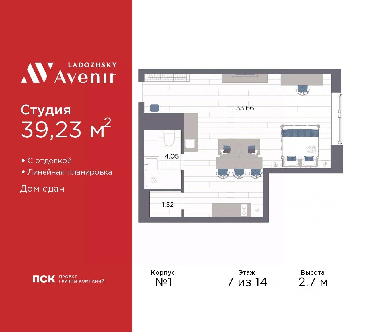 Продаются 1-комн. апартаменты-студия с отделкой в ЖК "Ladozhsky AVENIR" на 7 этаже. Общая площадь: 39.23 кв.м., площадь гостиной 33.66 кв.м., из которых 5 кв.м. выделено под кухонную зону. Все окна выходят на одну сторону. В апартаментах один совмещенный санузел. Высота потолков 2.7 м.