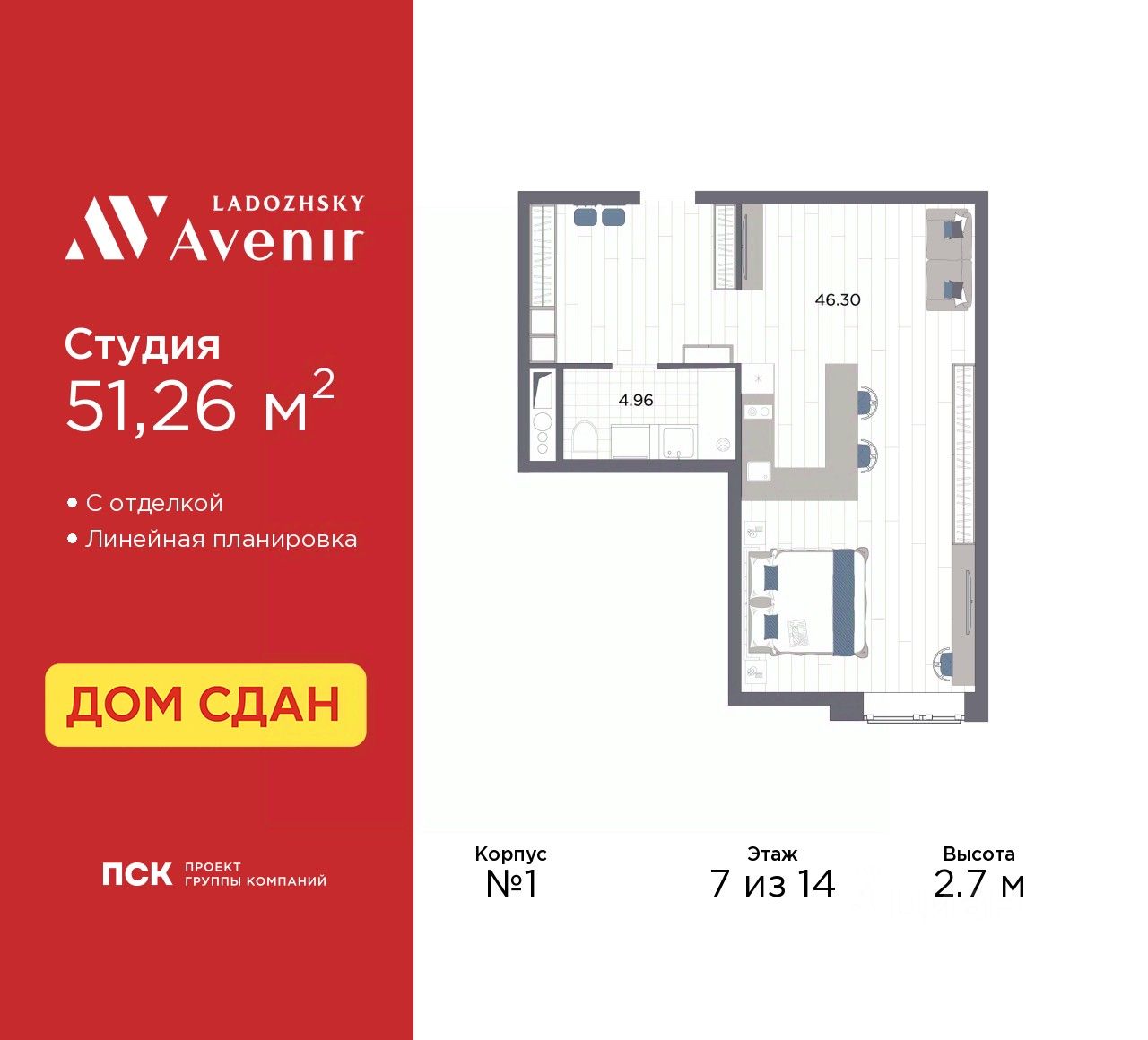 1-комн. апартаменты-студия с отделкой в ЖК "Ladozhsky AVENIR" на 7 этаже. Общая площадь: 51.26 кв.м., площадь гостиной 46.3 кв.м., из которых 10 кв.м. выделено под кухонную зону. Все окна выходят на одну сторону. В апартаментах один совмещенный санузел. Высота потолков 2.7 м.