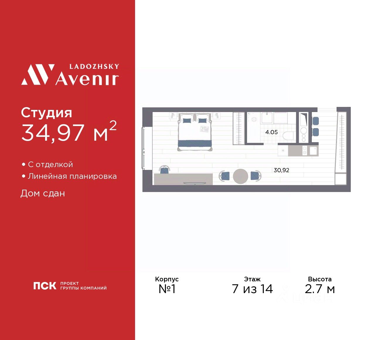 Просторные 1-комн. апартаменты-студия с отделкой в ЖК "Ladozhsky AVENIR" на 7 этаже. Общая площадь: 34.97 кв.м., площадь гостиной 30.92 кв.м., из которых 5 кв.м. выделено под кухонную зону. Все окна выходят на одну сторону. В апартаментах один совмещенный санузел. Высота потолков 2.7 м.