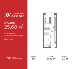 1-комн. апартаменты-студия от застройщика с отделкой в ЖК "Ladozhsky AVENIR" на 11 этаже. Общая площадь: 25.68 кв.м., площадь гостиной 21.63 кв.м., из которых 5 кв.м. выделено под кухонную зону. Все окна выходят на одну сторону. В апартаментах один совмещенный санузел. Высота потолков 2.7 м.