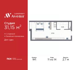 Просторные 1-комн. апартаменты-студия с отделкой в ЖК "Ladozhsky AVENIR" на 11 этаже. Общая площадь: 31.15 кв.м., площадь гостиной 27.1 кв.м., из которых 5 кв.м. выделено под кухонную зону. Все окна выходят на одну сторону. В апартаментах один совмещенный санузел. Высота потолков 2.7 м.