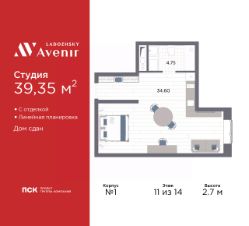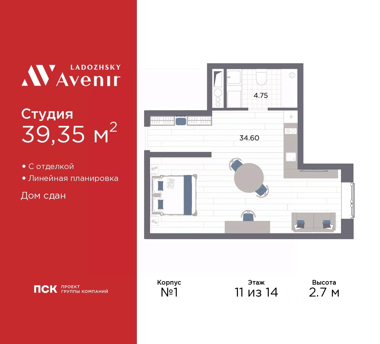 1-комн. апартаменты-студия от застройщика с отделкой в ЖК "Ladozhsky AVENIR" на 11 этаже. Общая площадь: 39.35 кв.м., площадь гостиной 34.6 кв.м., из которых 5 кв.м. выделено под кухонную зону. Все окна выходят на одну сторону. В апартаментах один совмещенный санузел. Высота потолков 2.7 м.
