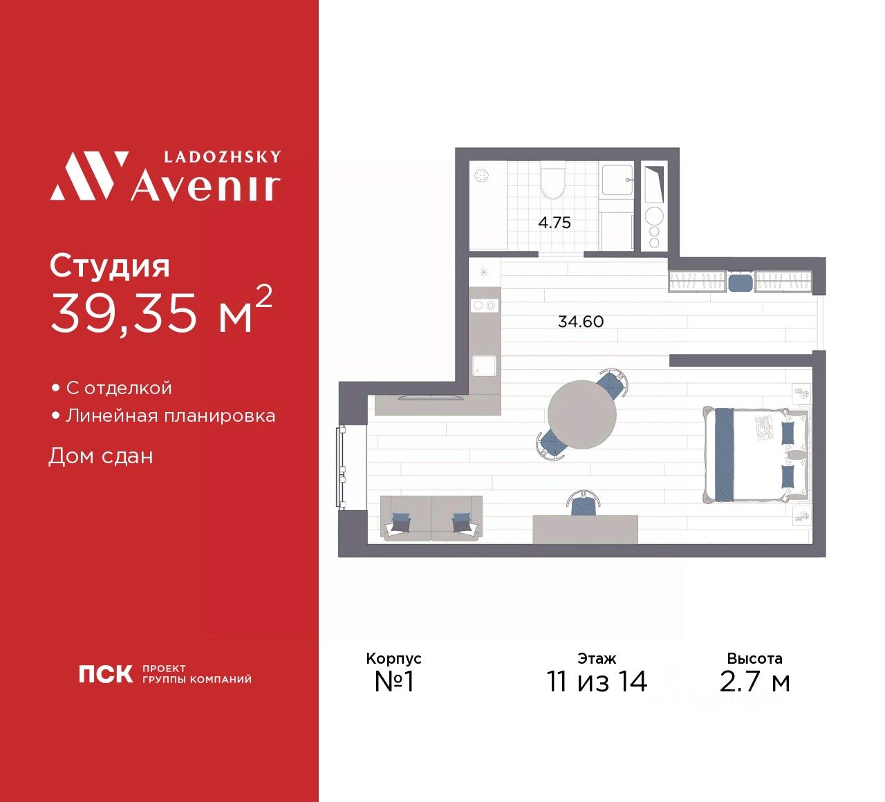 1-комн. апартаменты-студия с отделкой в ЖК "Ladozhsky AVENIR" на 11 этаже. Общая площадь: 39.35 кв.м., площадь гостиной 34.6 кв.м., из которых 5 кв.м. выделено под кухонную зону. Все окна выходят на одну сторону. В апартаментах один совмещенный санузел. Высота потолков 2.7 м.