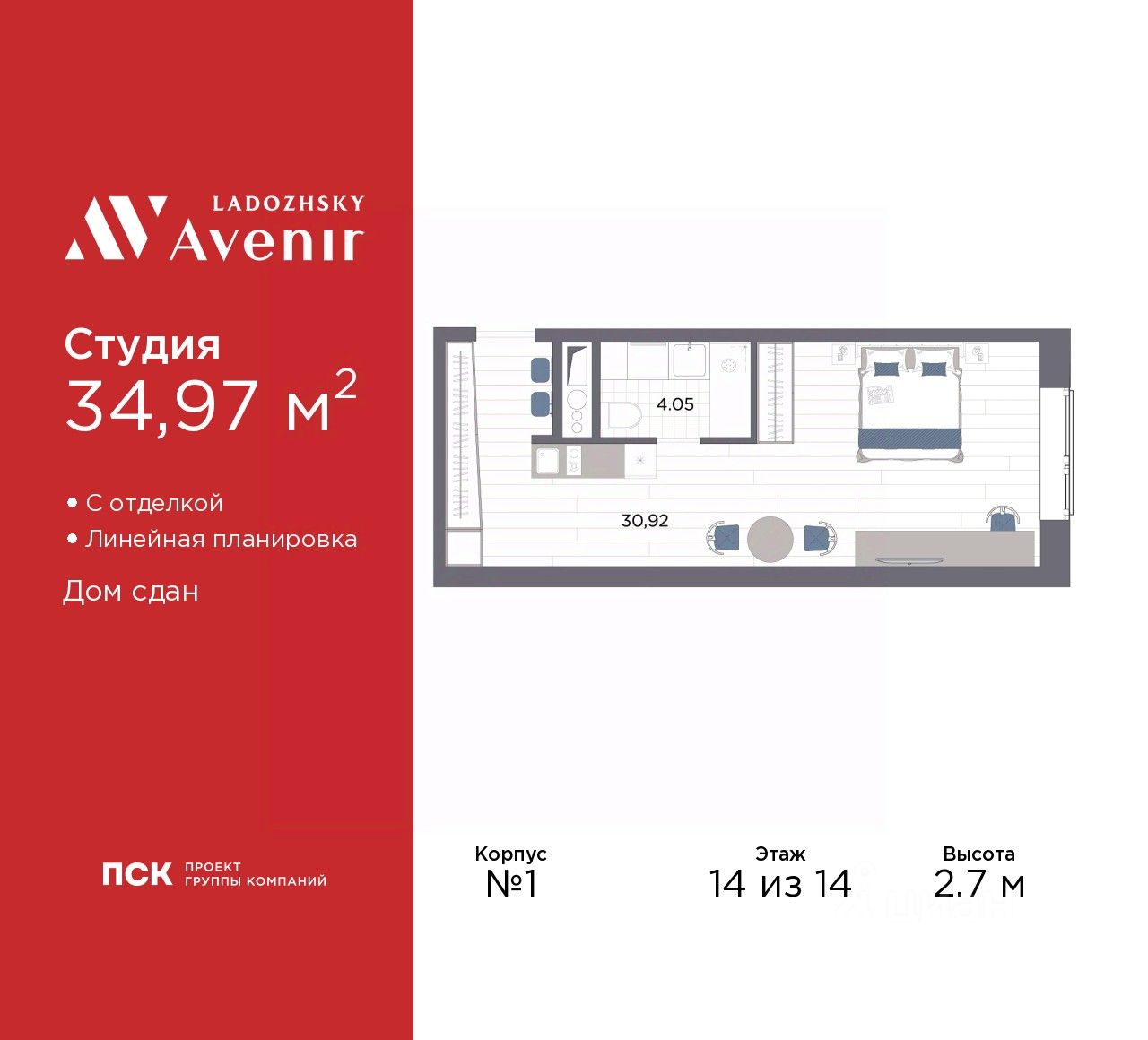 Однокомнатные апартаменты-студия от застройщика с отделкой в ЖК "Ladozhsky AVENIR" на 14 этаже. Общая площадь: 34.97 кв.м., площадь гостиной 30.92 кв.м., из которых 5 кв.м. выделено под кухонную зону. Все окна выходят на одну сторону. В апартаментах один совмещенный санузел. Высота потолков 2.7 м.