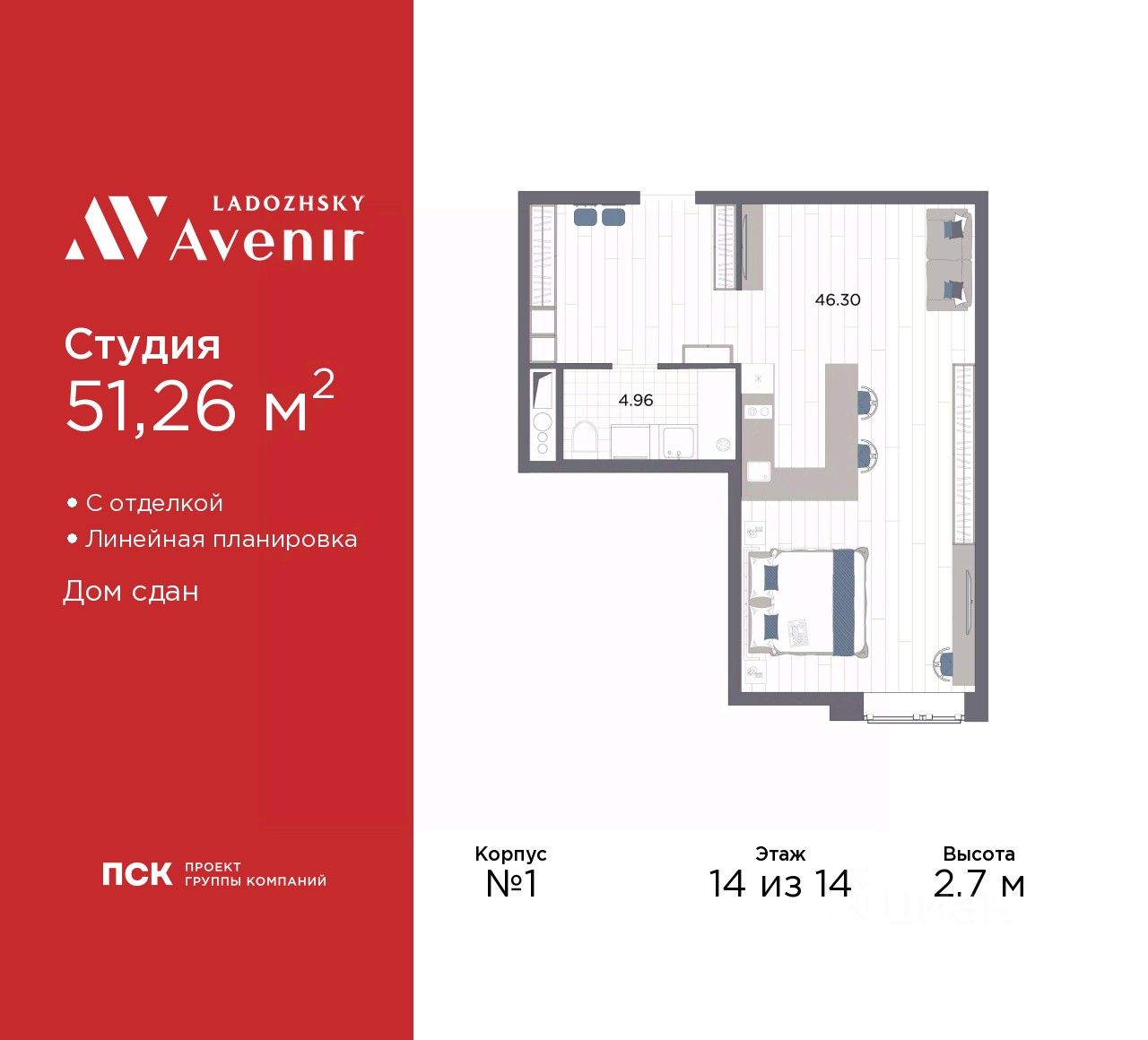 1-комн. апартаменты-студия с отделкой в ЖК "Ladozhsky AVENIR" на 14 этаже. Общая площадь: 51.26 кв.м., площадь гостиной 46.3 кв.м., из которых 10 кв.м. выделено под кухонную зону. Все окна выходят на одну сторону. В апартаментах один совмещенный санузел. Высота потолков 2.7 м.