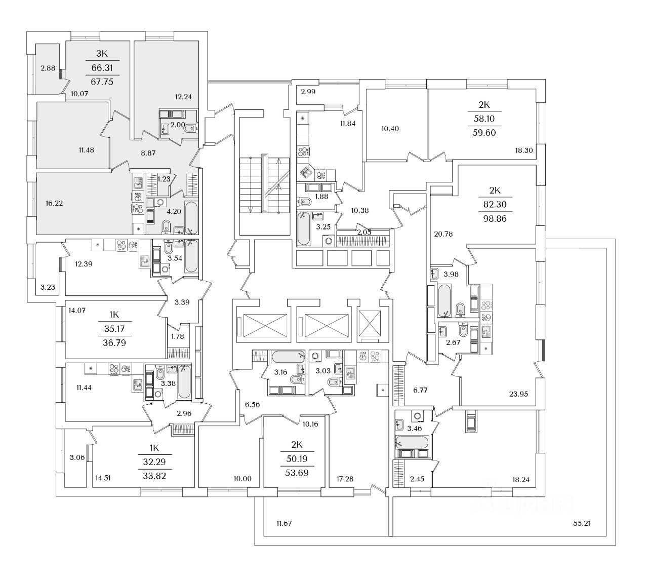 Квартира находится в 22 этажном доме, в Корпус 5 на 16 этаже. Общая площадь квартиры 67,75 кв.м.
