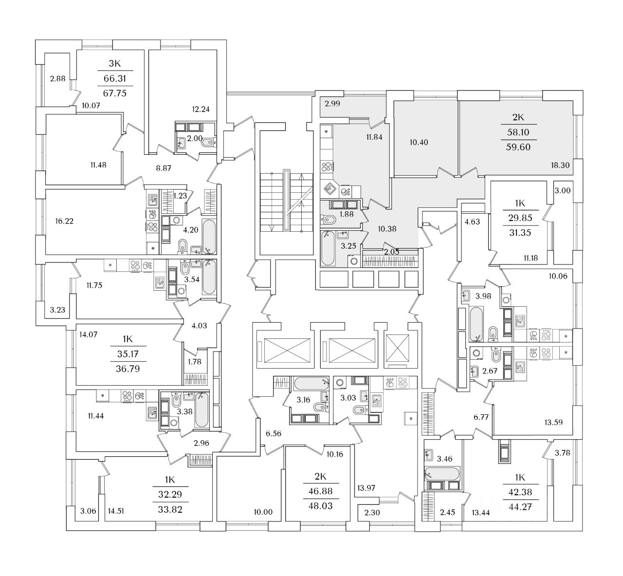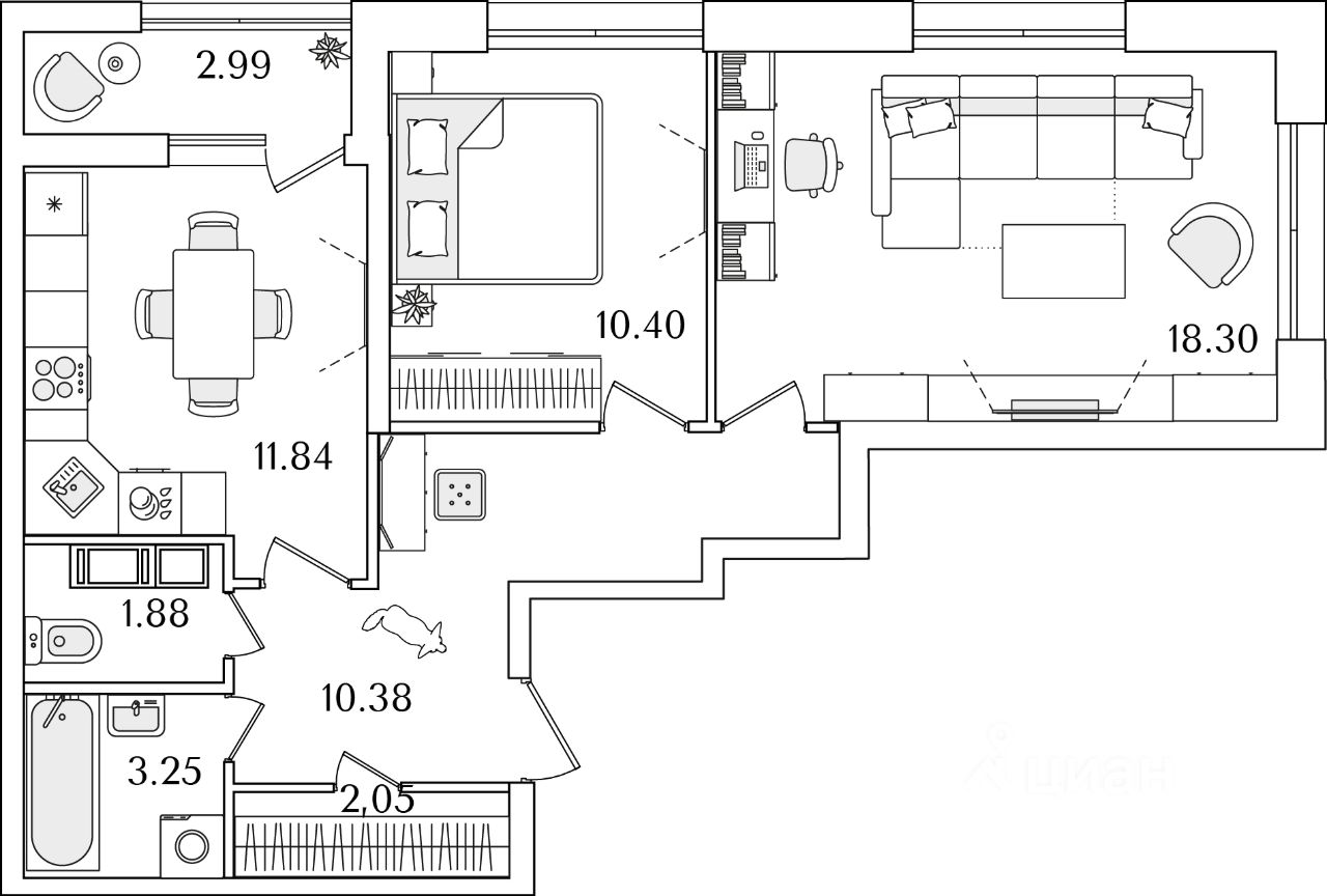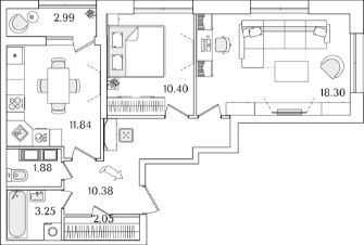 Квартира находится в 22 этажном доме, в Корпус 5 на 18 этаже. Общая площадь квартиры 59,60 кв.м.